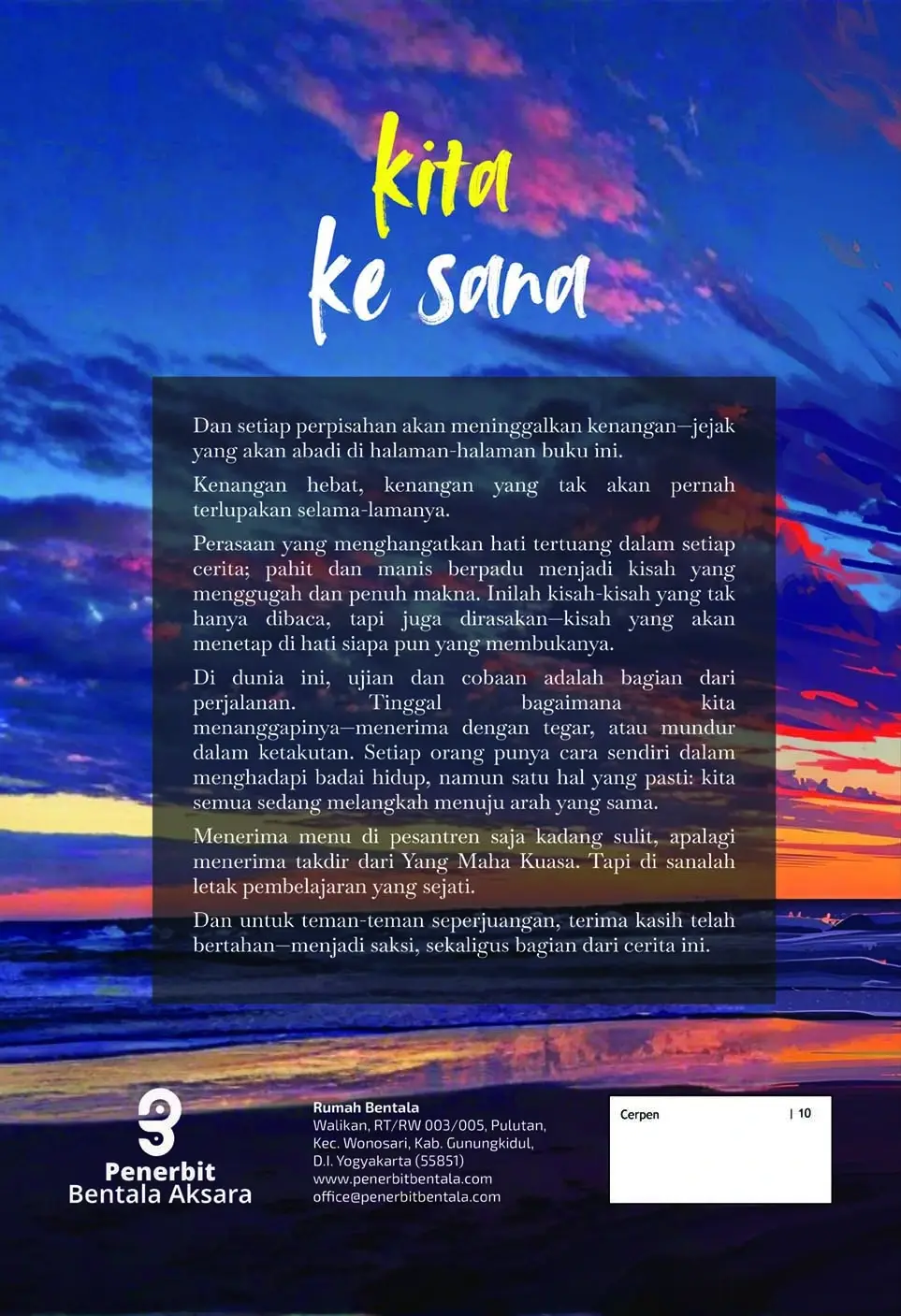 “Kita Ke Sana” adalah kumpulan cerpen karya santri kelas 9C angkatan 19 SMPS IT Riyadhussholihin. Di dalamnya tersimpan kisah nyata perjalanan hidup kami—tentang pengalaman sehari-hari, persahabatan yang tumbuh, perjuangan yang dilalui, hingga perasaan yang menguatkan diri sepanjang masa belajar di sekolah dan pesantren.